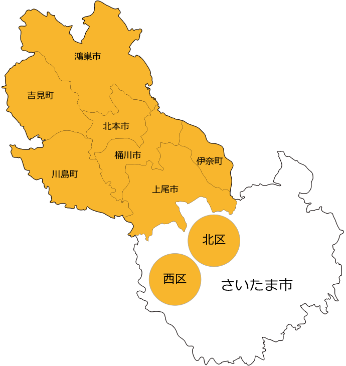 さいたま市西区・北区、上尾市、桶川市、北本市、鴻巣市、伊奈町、川島町、吉見町